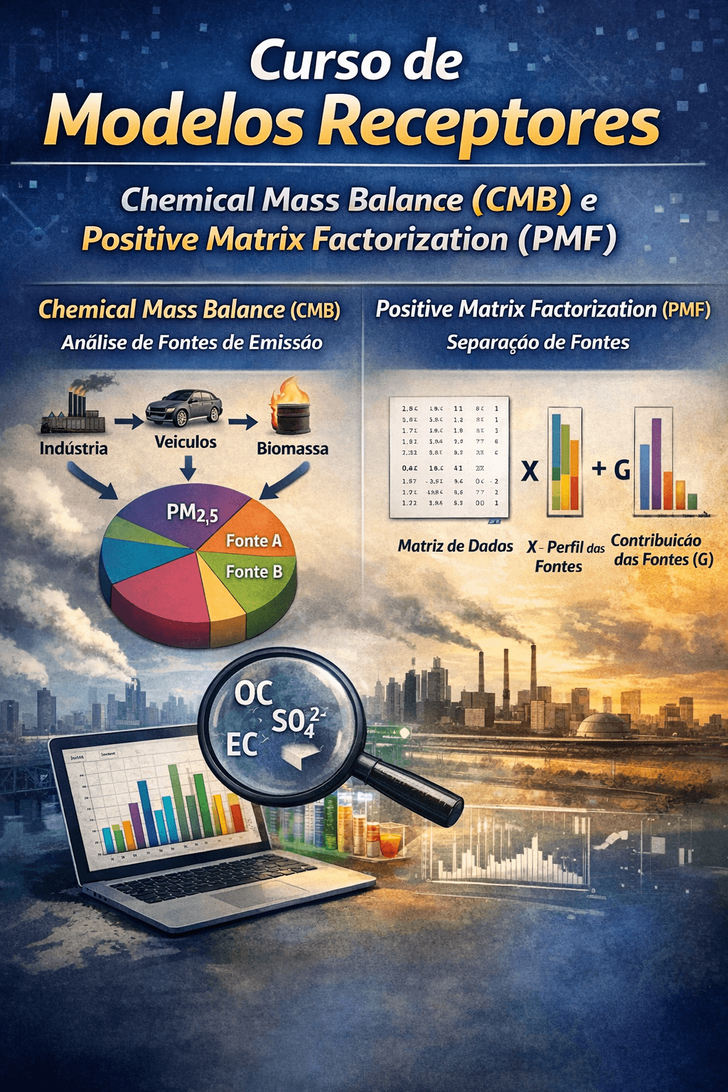 The course presents the theoretical principles of Chemical Mass Balance (CMB) and Positive Matrix Factorization (PMF), with emphasis on their application to particulate chemical composition data, including elemental carbon (EC), organic carbon (OC), inorganic ions, trace elements, and crustal material. Special attention is given to the differences in behavior and characterization of fine particles, coarse fractions, TSP, and sedimentable particles, particularly in urban and industrial environments.