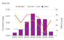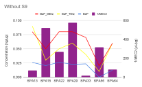 Figure 1. BaP-MEQ, BaP–TEQ, BaP (ng per μg of PM) concentrations in Y1 and mutagenic potencies (1/MEC2 in μg of PM) without (A) and with metabolic activation (+S9) (B).